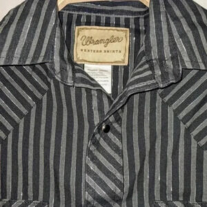 Elevate your style with this vintage Wrangler Western Shirt, perfect for any occasion. This black shirt features metallic thread accents, a collared neckline, and a snap front closure. The long sleeves with snap cuffs make it a great choice for any season.