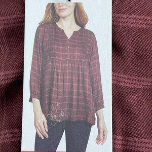 Wrangler Womens Burgundy Plaid 3/4 Sleeve Top L Viscose NWT 3299