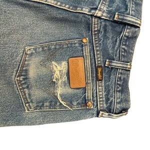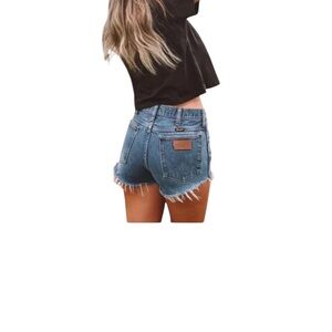 Chic Wrangler shorts with frayed hem. Light blue denim for a trendy look. Perfect for casual wear.