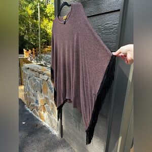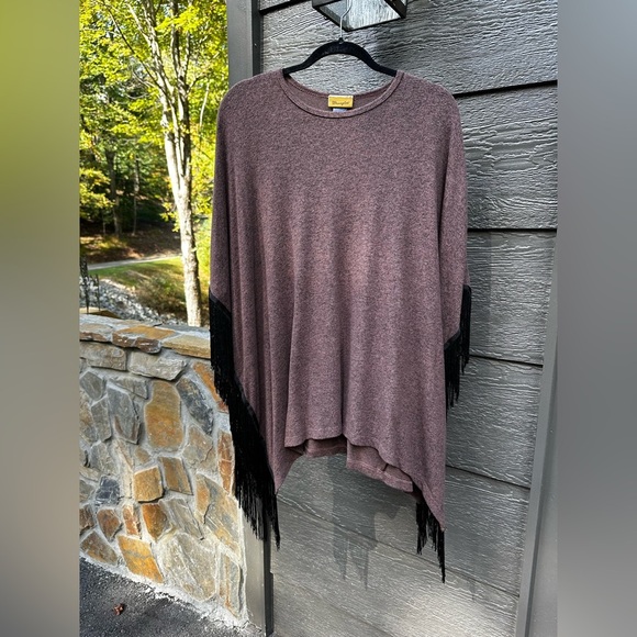 Keywords: Wrangler poncho, fringe detail, heathered knit, mauve top, pullover, women's fashion, boho style, western wear, cozy knit, versatile layering, fall fashion, winter wear, casual chic