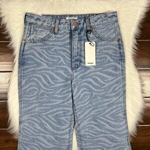 Wrangler Women's Size 28 X 32 Meow Tiger Print Wanderer 622 High Rise Flare Denim Jeans, No Stretch, Zipper Fly, Five Pockets, 100% Cotton, Raw Edge Hemlines