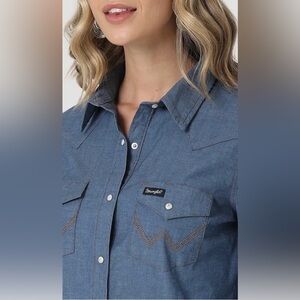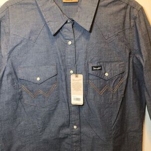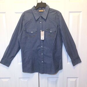 Wrangler Women's Solid Chambray Denim Long Sleeve Snap Western Core Shirt Size L. New with tag. From smoke free home. * photo colors may appear slightly different than actual item due to lighting.