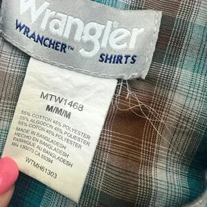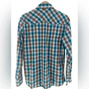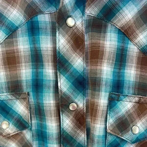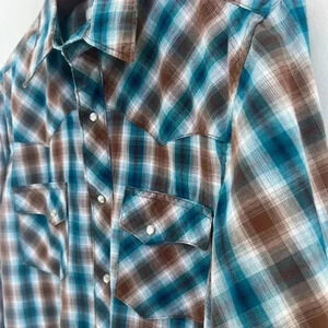 Wrangler Wrancher Men’s Pearl Snap Western Teal & Brown Plaid Shirt