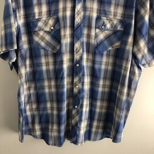 This shirt is labeled as a size 3X and is part of the Wrangler Wrancher product line. It's a button-up casual shirt suitable for all seasons. Don't miss out on the chance to add this versatile and fashionable shirt to your collection.