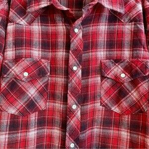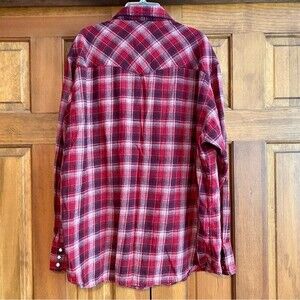 Thanks for looking! Here is a Wrangler Wrancher Shirts Men’s flannel shirt red white plaid Pearl snaps size XXL.