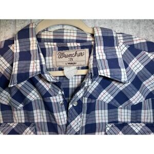Embrace the classic Western vibe with the Wrangler Wrancher VTG 3XL button-up shirt. Featuring a timeless blue plaid pattern, short sleeves, and the convenience of snap closures, this shirt is a testament to effortless style and comfort. Made from durable cotton, it's designed to withstand the rigors of daily wear while keeping you cool with its lightweight fabric.