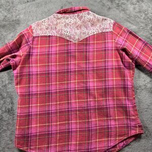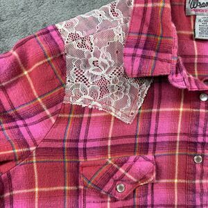 Wrangler Wrancher Women Pearl Snap Flannel Pink Plaid Lace Accents Size XL D111