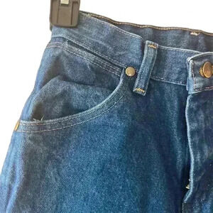 Keywords: Wrangler, youth jeans, slim fit, straight style, blue denim, dark wash, five-pocket, button closure, casual wear, semi-formal, machine washable, pre-owned, excellent condition.