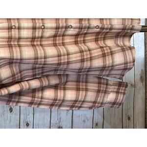 Rose, brown and white plaid; collared; long sleeves w/ two snap buttons on cuffs; 7-button front placket; slight curved hem