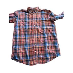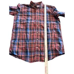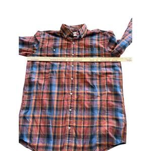 Wrangler men's LT button down, long sleeve plaid shirt. Made of cotton & polyester. Shades of rich orange, rust, black, and blue colors. ***** THIS IS NOT FLANNEL.