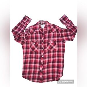 Wrangler wrancher cowboy plaid button down shirt red black and white. Pearlized snap buttons great condition. Sz Large
