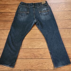 These Wrangler jeans feature a relaxed fit in a medium indigo blue, offering a comfortable and timeless style. The denim showcases a slightly worn-in appearance with subtle fading and whiskering, perfect for a casual, laid-back look. Mens 38x32. Excellent pre-owned condition