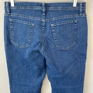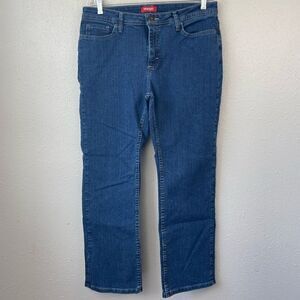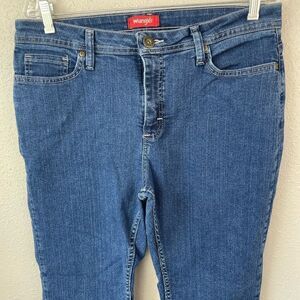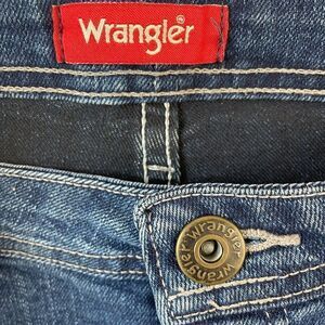 Classic pair Wrangler jeans, measuring 17 inches at the waist laying flat with a 27 inch inseam.
