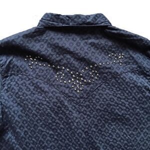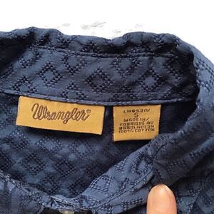 Vintage Wrangler Blue Silver Tone Stud Embellished Diamond Shape Pearl Snap Diamond Print Western Long Sleeve Shirt