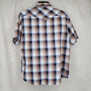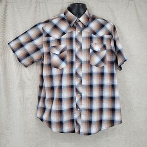 Brown plaid short sleeve pearl snap shirt.