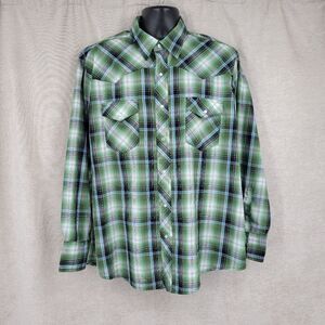 Green plaid long sleeve pearl snap shirt.