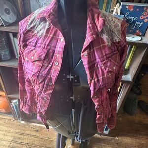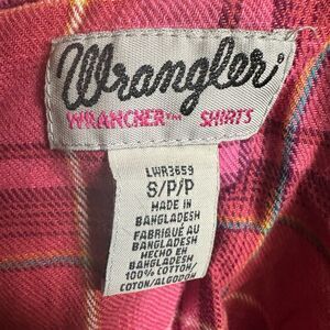 Wrangler lace shoulders, Western style button down, pink plaid shirt. Collar. Looks great with a favorite pair of jeans and cowboy boots. Approximately 19.5 inches from armpit to armpit, 24 inches long. From a pet and smoke free house. Bundle and save! Open to reasonable offers.