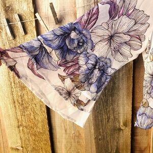 Gorgeous floral sheer wrap blouse. Ties at the waist and features Bell Sleeves with ruffled cuffs. Very femine, very Boho. The front chest area is lined.