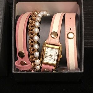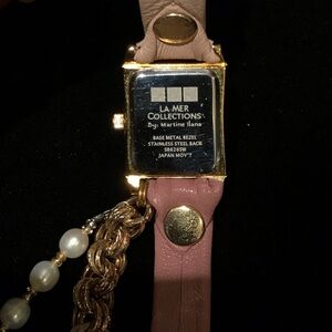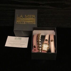 Pink and mauve wrap bracelet style watch by La Mer Collections in the original box. It has been worn a few times but in good condition. Needs a battery.