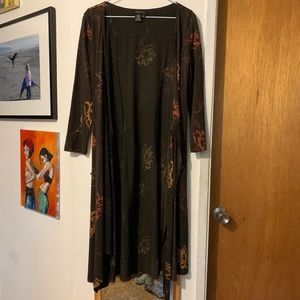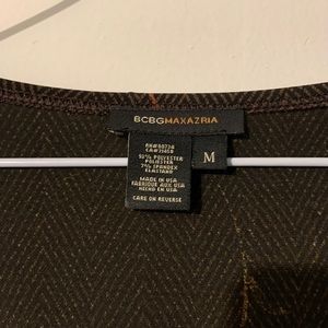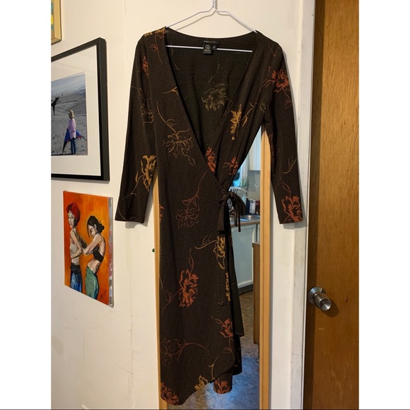 Brown floral BCBG Maxazaria dress, true wrap, size medium, no known flaws. Bottom sits below my knees and I’m 5’4. Would try on for you but it doesn’t fit me! Slightly see through. Love this dress!