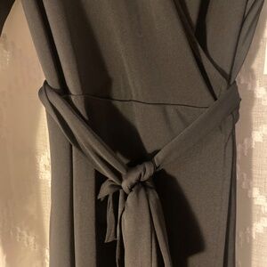 Black long sleeve wrap dressy. Material is thick polyester/spandex blend. Has pockets!