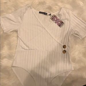 White Ribbed Wrap Front Button Bodysuit