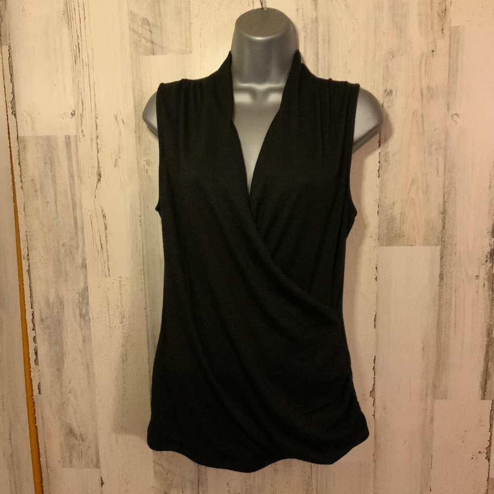 This wrap top is perfect for any occasion. Wrap design in feont with low cut nieckline. Gathered side. High neck in back. Sleeveless. Hangs beautifully. Brand new. Never worn.