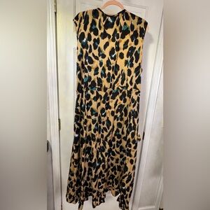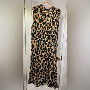 A flattering sleeveless V-neck dress in tan with bold black and teal leopard print. Lightweight fabric and a front slit create easy movement. Designed for everyday wear and special occasions. Features a defined waist for a polished silhouette.