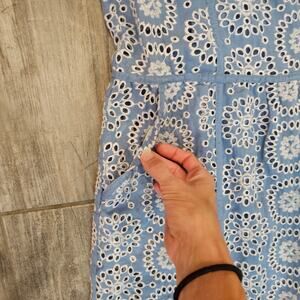 Wrap London sleeveless eyelet dress, women’s size 10. Features a light blue base with white embroidered eyelet overlay, fitted bodice, and soft midi-length skirt. Fully lined with back zip closure and a structured yet feminine silhouette. Beautifully made from breathable cotton—perfect for spring and summer occasions.