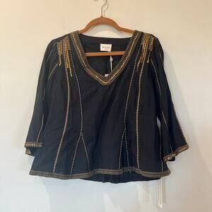 Wrap London Godet Cotton Sequin Bell Sleeve V Neck Blouse Sz 6 Black Gold