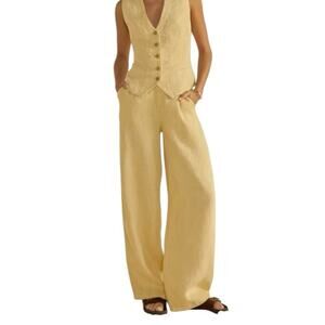 Wrap London Wide Leg Linen Trousers Pants size 12 Soft Lemon Yellow in excellent condition. Worn once! Measurements laying flat waist 17 1/2 inches across and inseam 29 inches and rise 14 1/2 inches