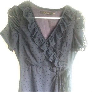 Faux wrap dress with cute heart print and ruffle accents by ark&co. Zipper and bow feature on side. Size S, I am usually a medium/small and this fits nicely. Purchased from mod cloth. Lined sheer material. Sometimes the color looks black but it is more of a navy blue or blue toned black.