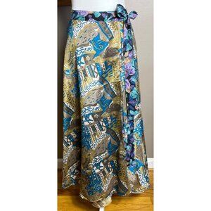 Colorful one-size wrap skirt, maxi, 2 layers chiffon blend fabric(no tag), 2 waist holes for size or style adjustment, multiple ways to style, top layer is purple & teal floral, longer layer is teal & beige arty pattern.