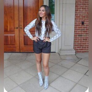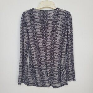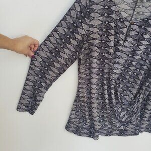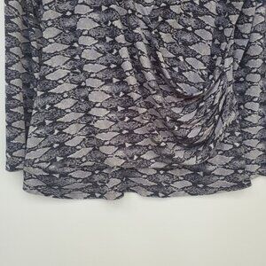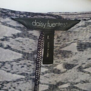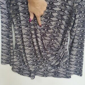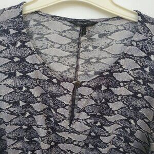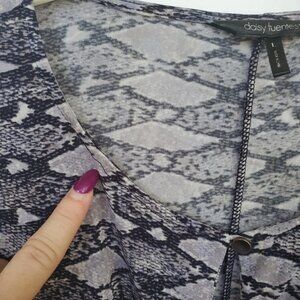 Fitted & Sexy! Long sleeve by Daisy Fuentes. Faux wrap,slimming! Not open across the front, sewn half of top, will never fly open and expose! See pic. Beautiful greyish purple snakeskin print. Slinky Feel. Lots of stretch! Keyhole button front closure @ neckline. This top is sexy and classy! Dress it up w/ skirt & boots, or throw on under your overalls! *Any discoloration is purely bad lighting. *Loose thread at neckline. Otherwise, EUC! Lots of options! **Inspirational outfit ideas included with like item, not exact - Ask me any questions!?!