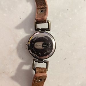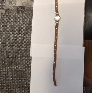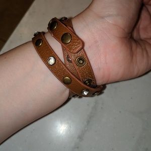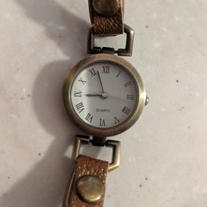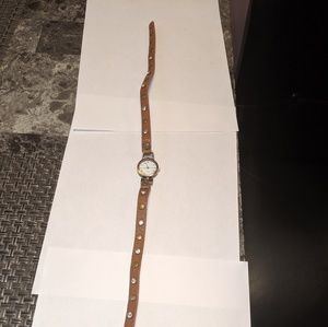 Brown Leather Studded Wrap Watch. Snap closure. Adjustable with 3 different snaps. Requires new battery. Around 22" long.