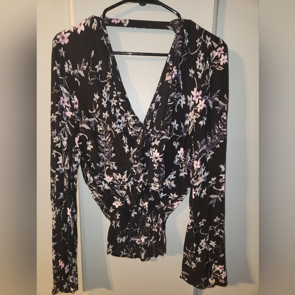 peplum bottom. wrap top. open back at top.