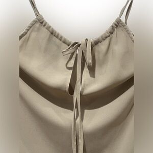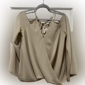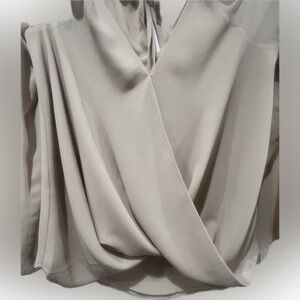 Open shoulder blouse with faux wrap front. Hook & eye closure on chest. Adjustable back tie for how low you would like it to sit. Flowy, V-neck, oversized cut.