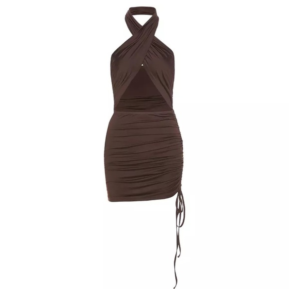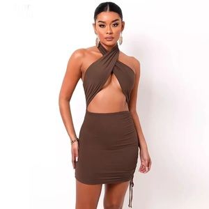 Details: Brown Cross Bandage Hollow Out Sleeveless Off Shoulder Dress