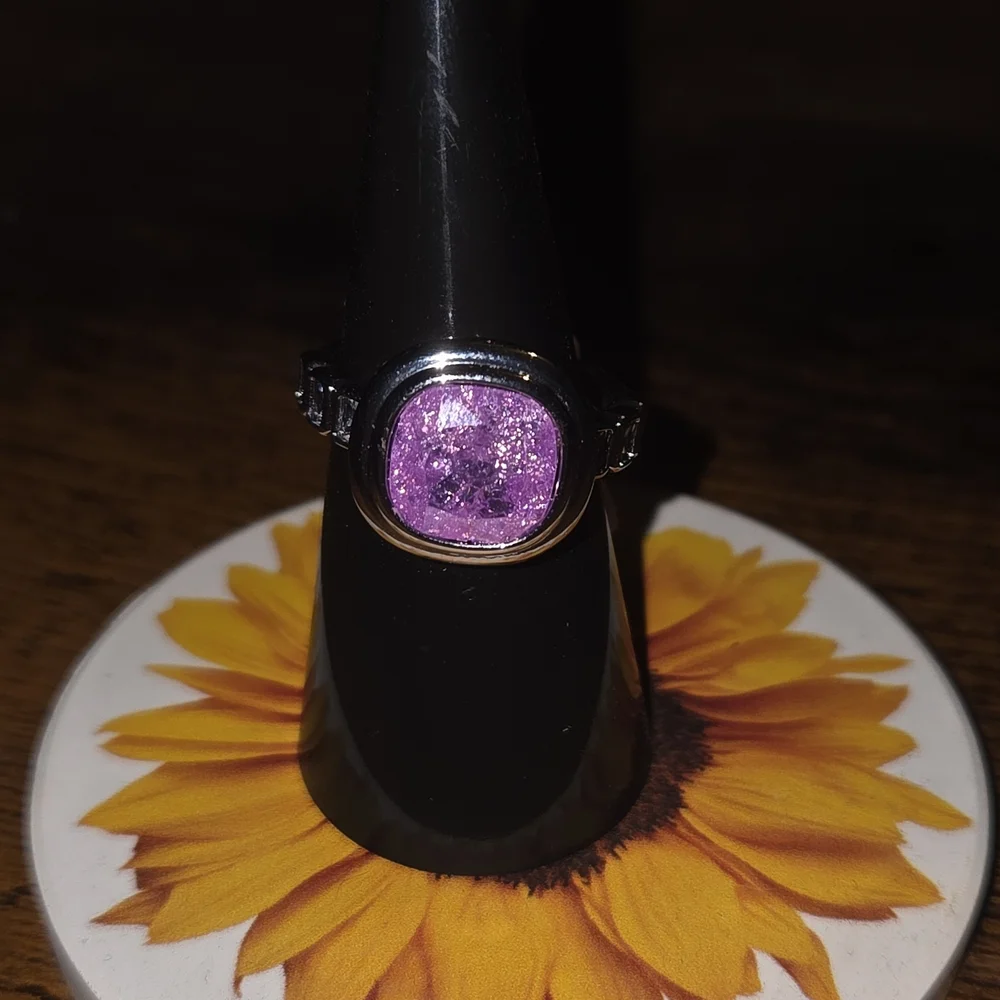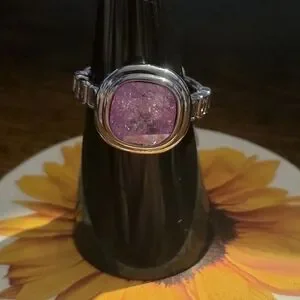 This chic women's ring showcases a dazzling pink stone set in a polished silver band. Ideal for adding a stylish touch to any ensemble.