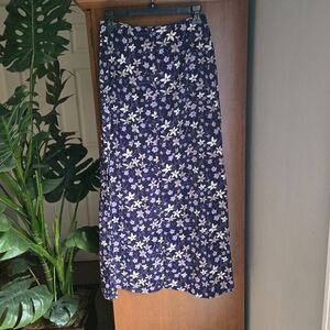 90s Vitnage Purple And off white/cream Maxi Skirt with floral patrern with modest slit on one side. excellent used condition. seeing no flaws. waist measures 25" and length is about 37".