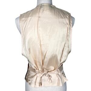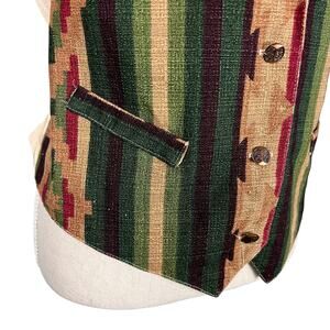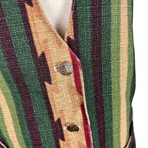 Wrapper USA vintage vest in women’s size Large. Features a bold Aztec/Southwest striped pattern in earthy green, tan, burgundy, and black tones. Detailed with unique crest-embossed buttons, two front pockets, and an adjustable tie-back waist. Fully lined in silky beige fabric. Perfect for boho, western, cottagecore, or 90s festival-inspired looks.