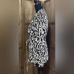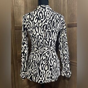 Wrapper women’s styish zebra print jacket. Double-breasted with a tie belt. Perfect for a bold look.