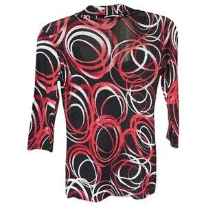 Style: Black & red, faux cami, unique, statement Features: Polyester spandex rayon, lightweight, stretch, 3/4 sleeve Flaws: Missing belt it initially came with. Light "fuzzing" from normal wash & wear. No stains, tears, or holes Wash Instructions: Hand or machine wash, dry flat Approximate Measurements: Shoulder to Shoulder: 14.5" Sleeve Length: 16" Pit to Pit: 15" Front Length: 24" DISCLOSURE: This item is pre-owned and has the possibility of previous shrinking or stretching. It is important to review the measurements before purchasing. There may be color variation due to lighting and display differences. Item has been cleaned.