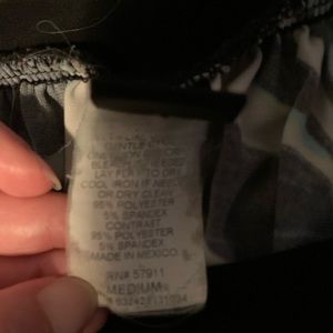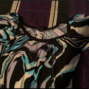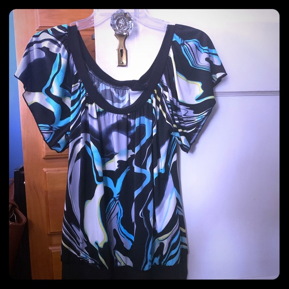 Wrapper juniors medium top. Blue and black flutter sleeve. Polyester and spandex blend.
