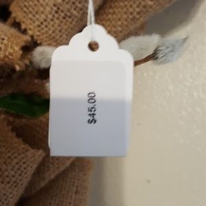 This beautiful wreath works for any time of year. Hand wrapped and tied on a metal frame, it is 26" across. It is natural color burlap and has made by hand burlap flowers and various dried stem components. It has the accent of dried cotton on each end of the floral side. On the opposite side there is a 9" by 6 1/2" wooden cross that is inset with burlap to match the flowers. The cross is stained light oak, misted with gold. This normaly sells for 60 but this price is for Poshers only!
