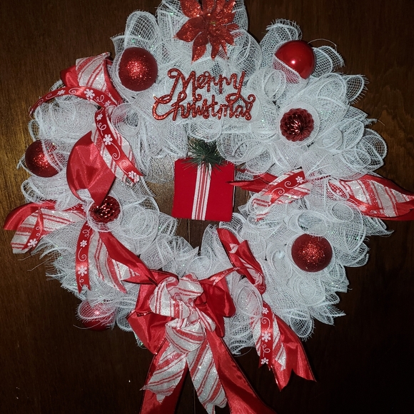 Handmade, red and white, holiday wreath.