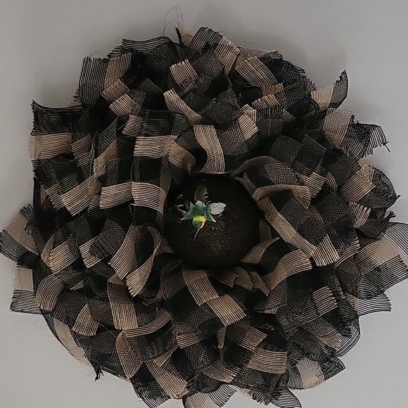 A beautiful wreath black and gold materials that can be used for decora or to adorn on your front door. A wreaths can have many meanings, including celebration, honor, and remembrance.