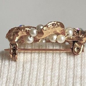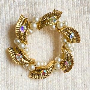 Wreath Brooch Iridescent Stones A String Of Faux Pearls Gold Tone Leaves