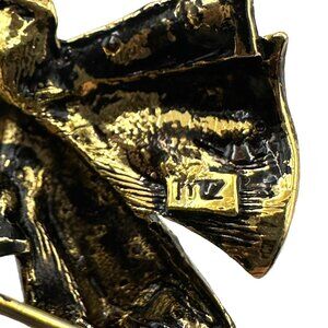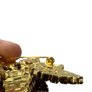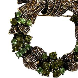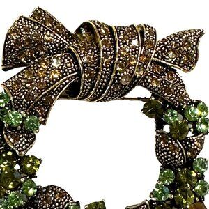 Wreath Brooch Pin With Green Rhinestones Bronze Bow Holiday Jewelry Lapel