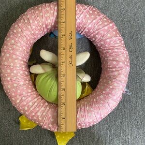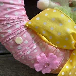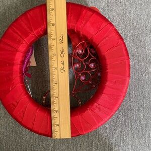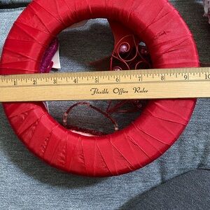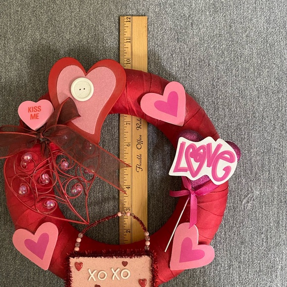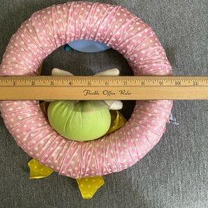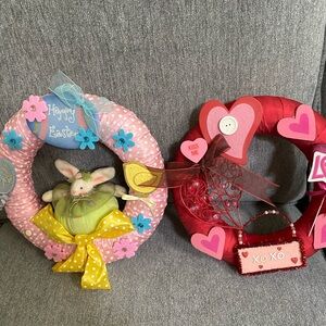 2 cute wreaths one for Valentine’s Day and another Easter. 9 1/2” H , width 9 1/2 “ L . Cute small wreath for a stand. Used the Easter one is missing a flower as shown. No hooks on the back. Two wreaths for $20.